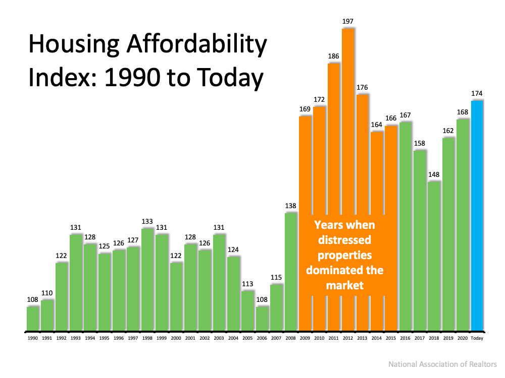 So, the higher the index, the more affordable it is to purchase a home. Here’s a graph of the index going back to 1990:The blue bar represents today’s affordability. We can see that homes are more affordable now than they’ve been at any point since the housing crash when distressed properties (foreclosures and short sales) dominated the market. Those properties were sold at large discounts not seen before in the housing market for almost one hundred years.